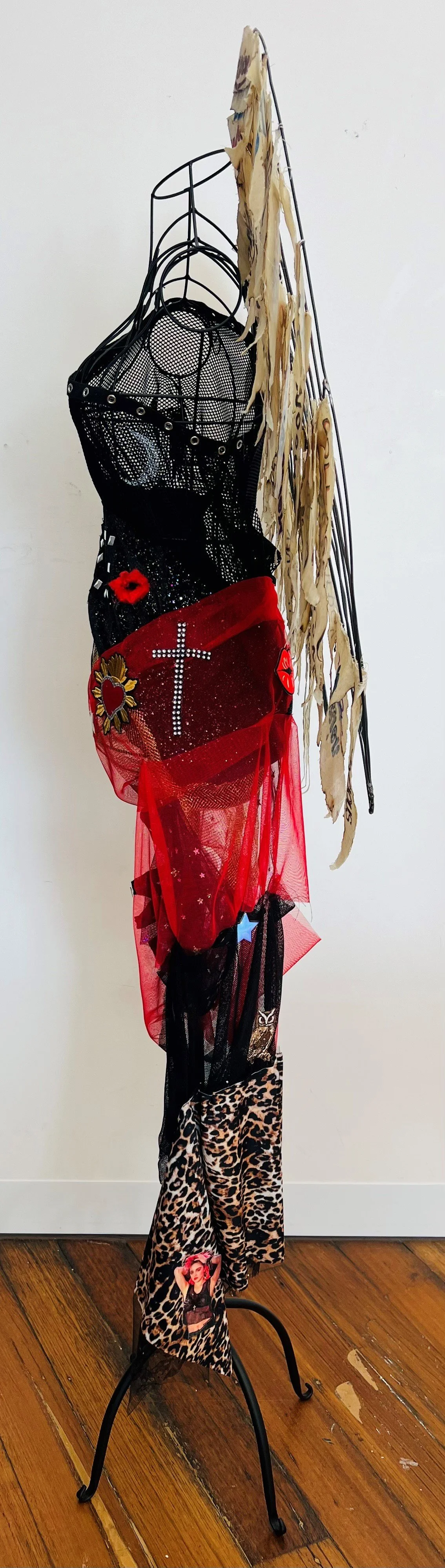 This artist's book intertwines symbolism from various realms, including religion, spirituality, mythology, celestial concepts, the supernatural, and elements from pop and punk/rock culture. The metal mannequin, depicted as an angel, embodies a fusion of strength and artificiality, while its handcrafted feather wings signify freedom and transformation.