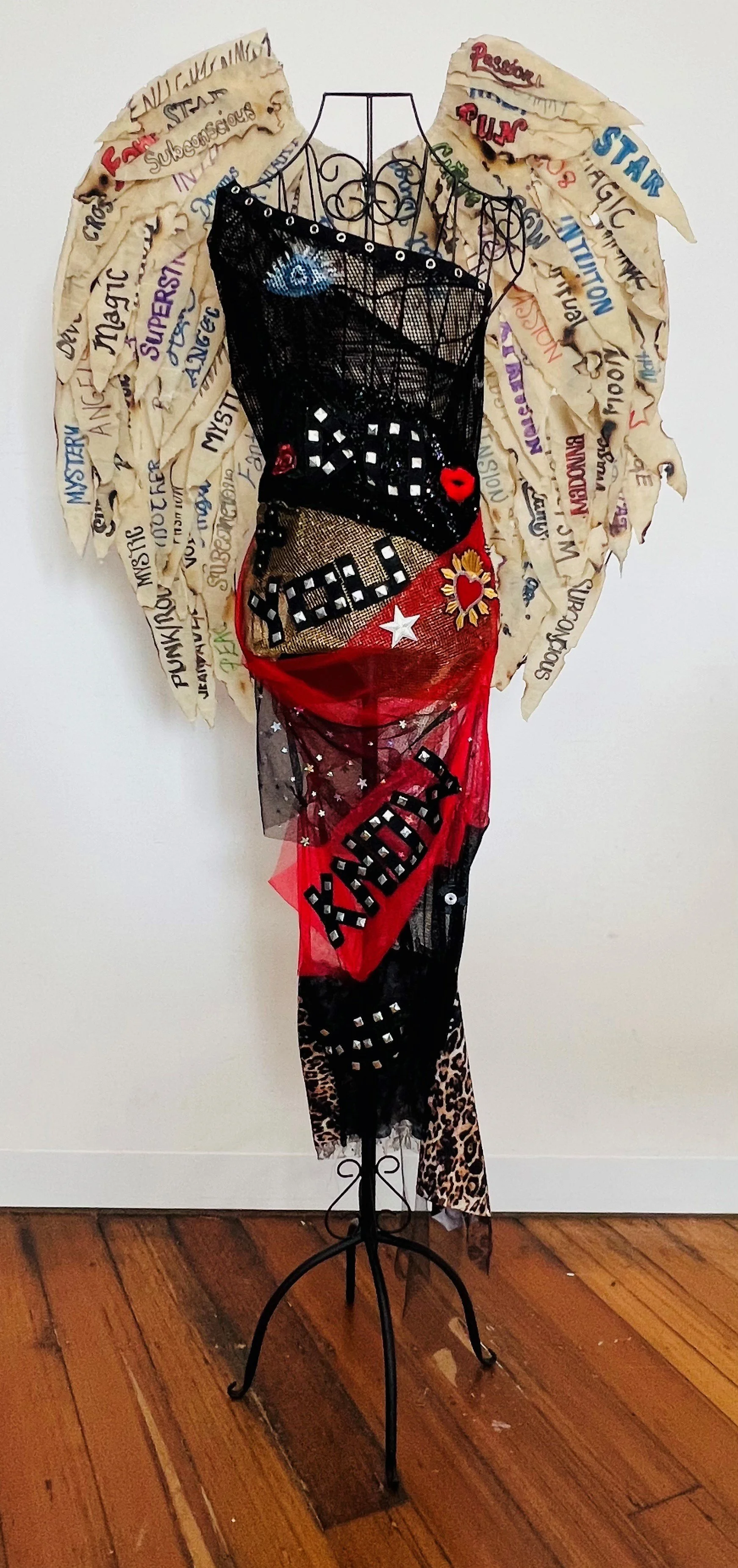 Each feather has been singed at the edges, inspired by the myth of Icarus, who dared to fly too close to the sun and whose feathers burned. Like Icarus, artists take risks, sometimes getting “burned,” yet they continue to push boundaries. Each feather is inscribed with text that echoes themes of intuition, celestial wonders, and the supernatural. This imagery is contrasted with materials that evoke the pop/rock/punk subculture, another important aspect of my life, alongside spiritual and religious imagery that symbolises protection and devotion. Overall, the piece delves into the interplay between the earthly and the divine, blending fantasy with reality and spirituality with crafted forms.